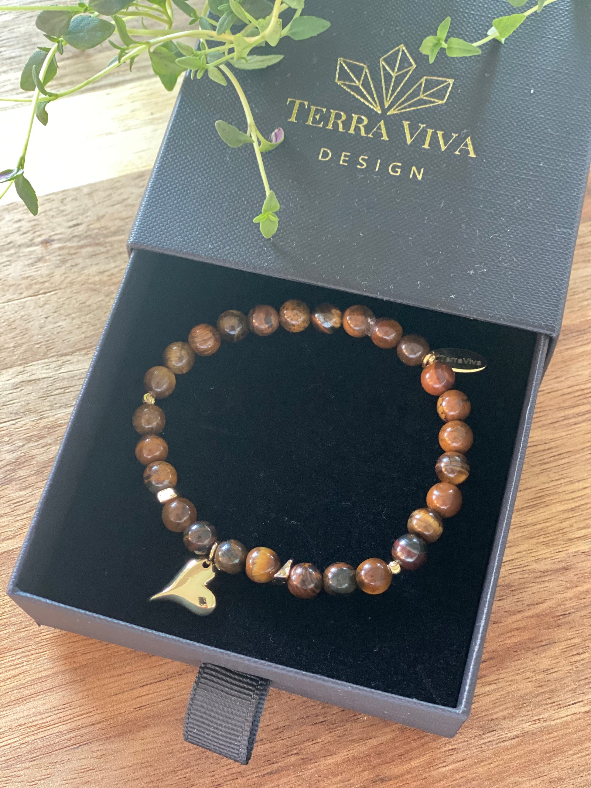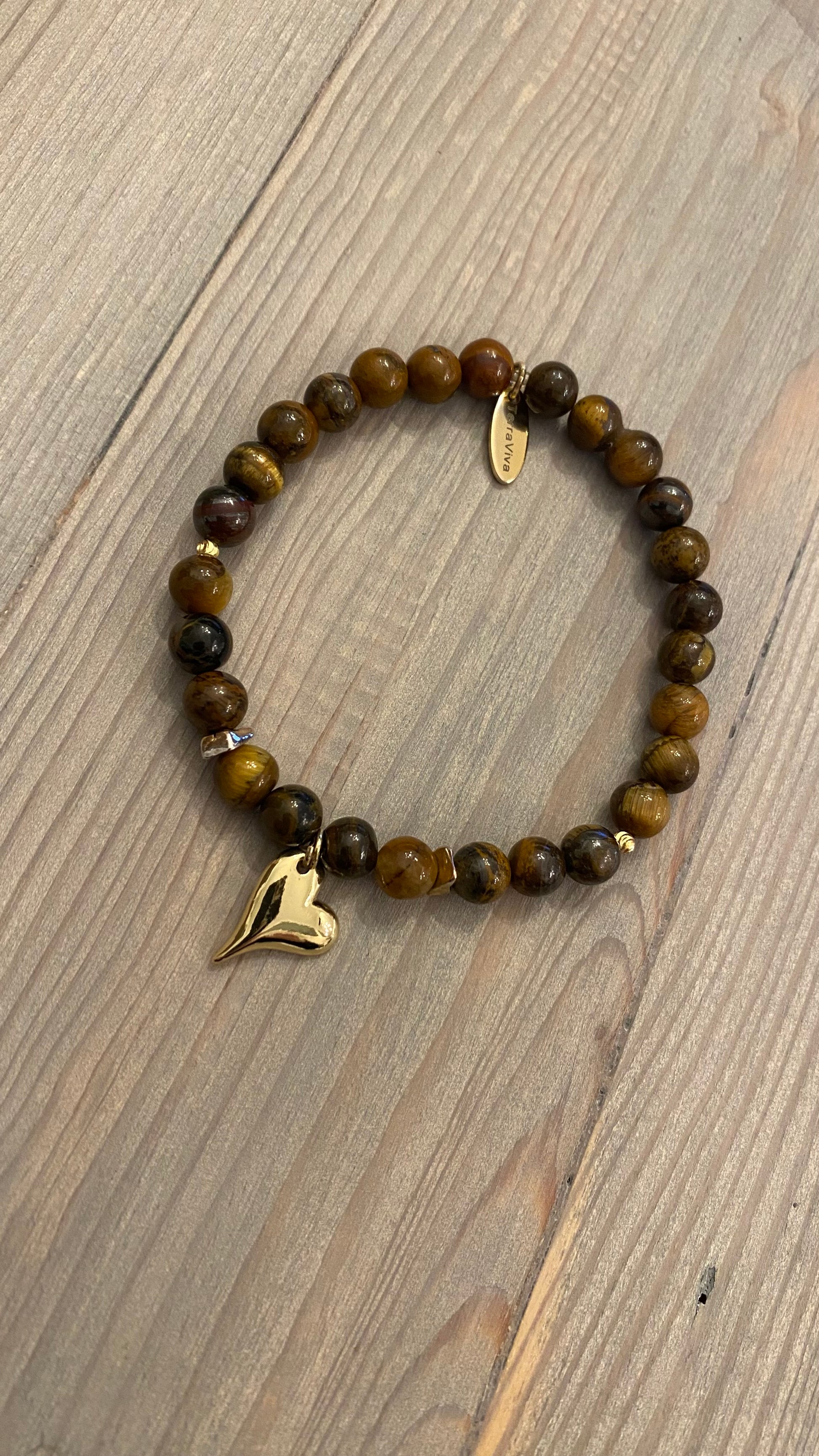 Hjertekraft er laget av Tigerøye og et lite 18k gyllforgylt hjerte, med tanke på noe du kan trenge i hverdagen.