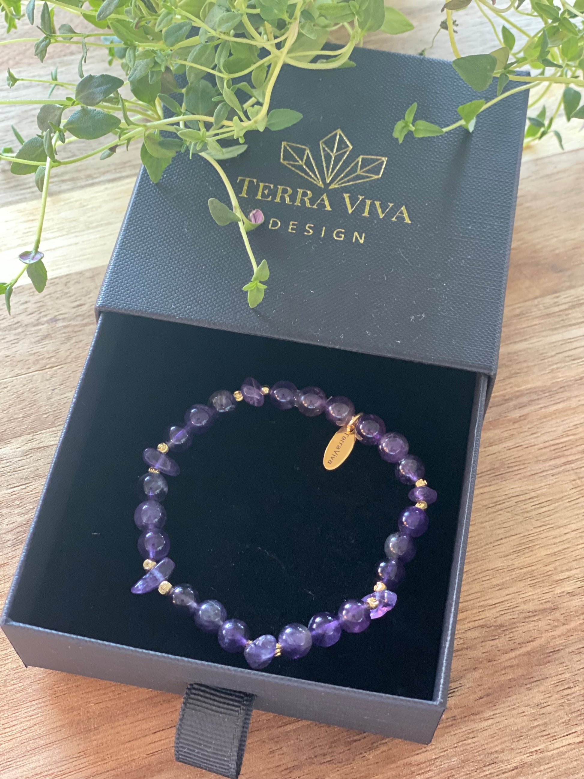Stillhet er laget med ametyst og detaljer i gull – satt sammen med tanke på deg som ønsker mer ro og tilstedeværelse i hverdagen.