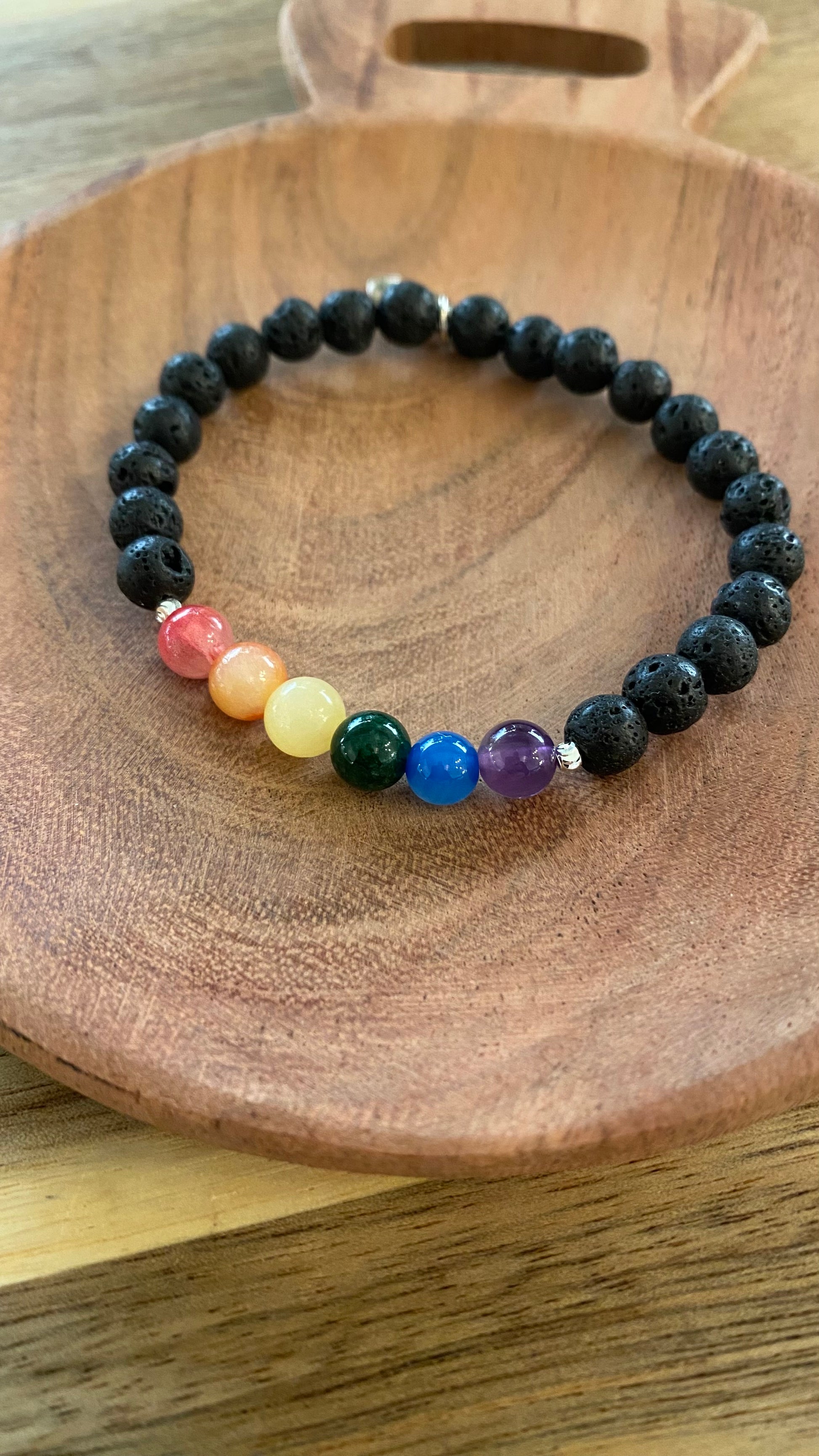 Stolthet er et armbånd laget av sort lavastein og regnbuestriper av ametyst, blå stripeagat, honningkalsitt, og jade i rødt, oransje og grønt.