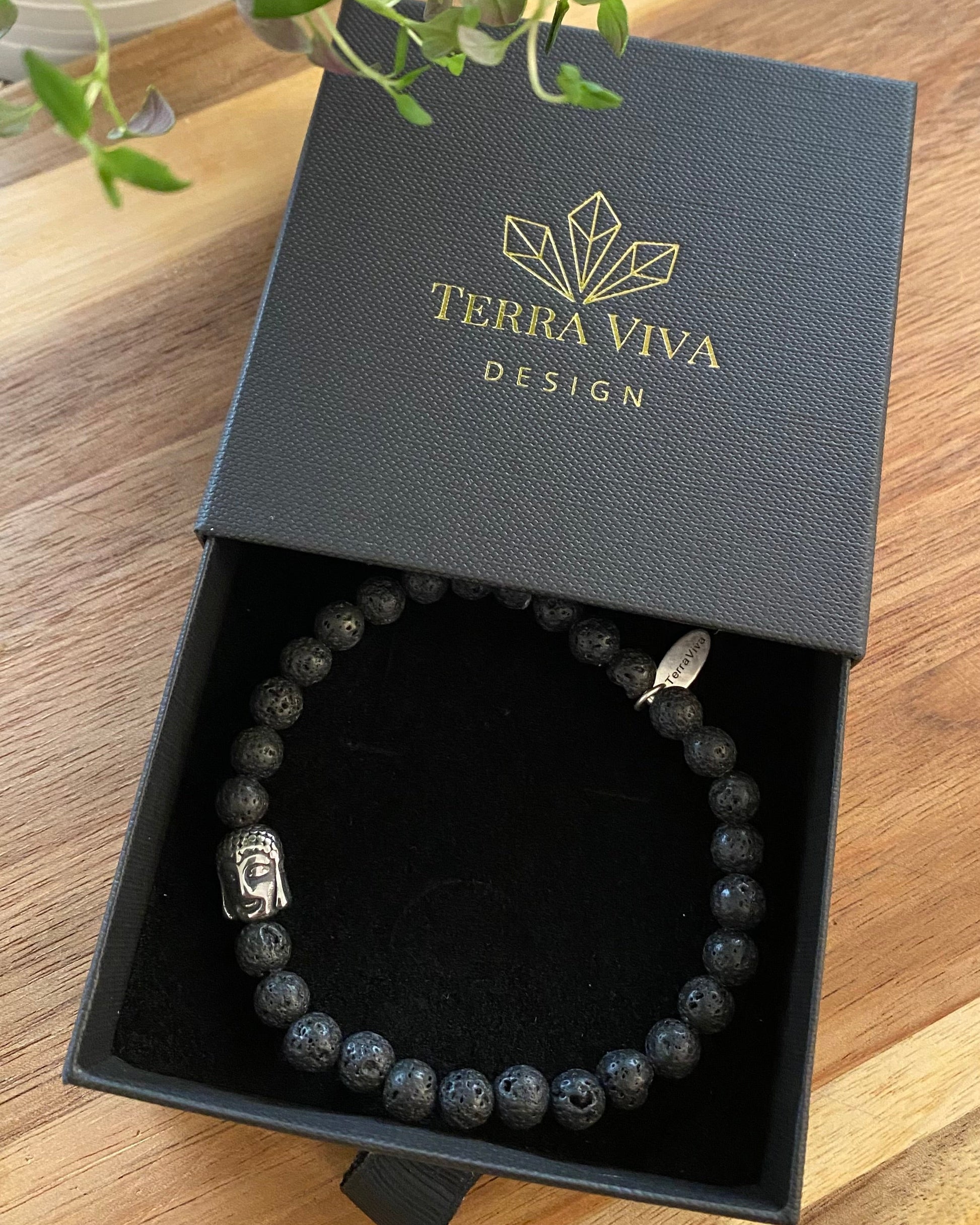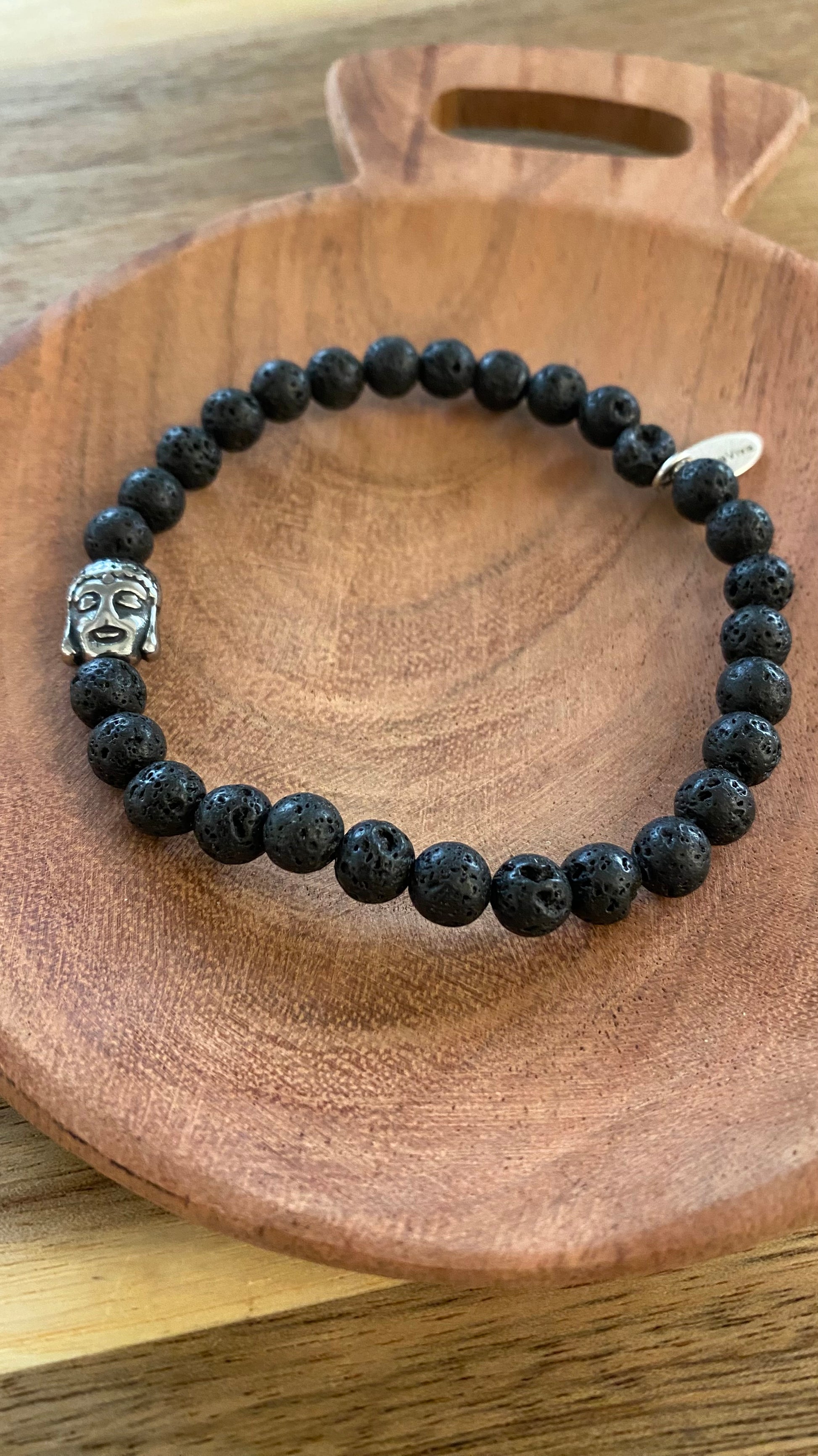 Et enkelt og meningsfullt armbånd laget med runde lavasteiner og en liten Buddha i midten.